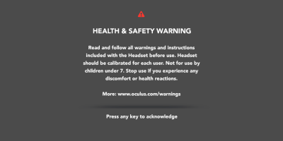 Oculus Rift DK2 から(?)、「HEALTH & SAFETY WARNING」が最初に自動表示されるようになっています。こちらは消さないでくださいという扱いだそうです。