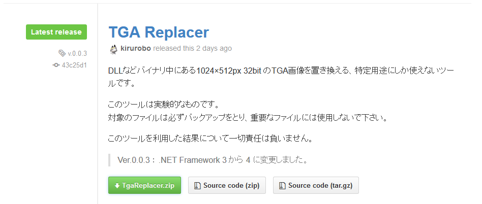 リンク先にある緑ボタンの「TgaRelpacer.zip」からをダウンロードしてきて、適当な所に解凍します。